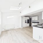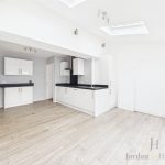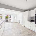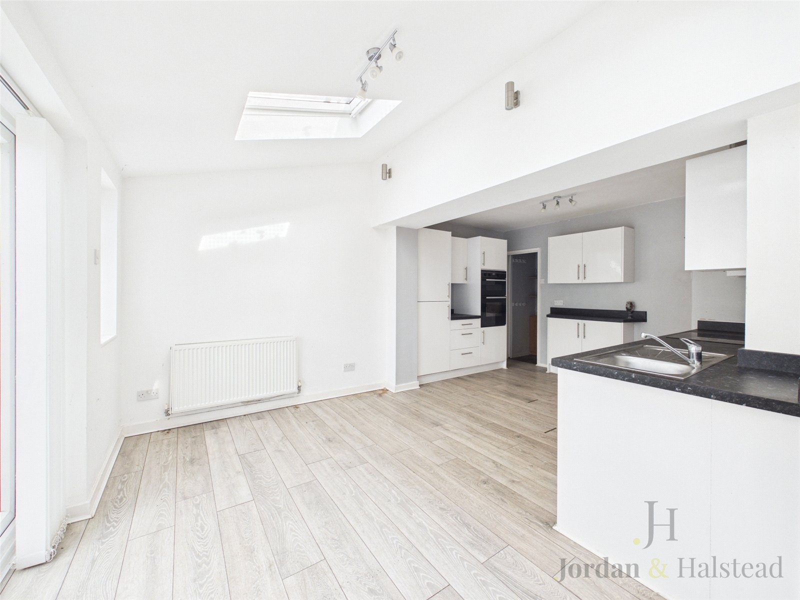 The standout feature of the home is the impressive open-plan living, dining, and kitchen area. The dining space is particularly bright, benefitting from Velux windows and patio doors that open onto the rear garden. The kitchen is fitted with a range of base and wall units, ample work surfaces, and integrated appliances.