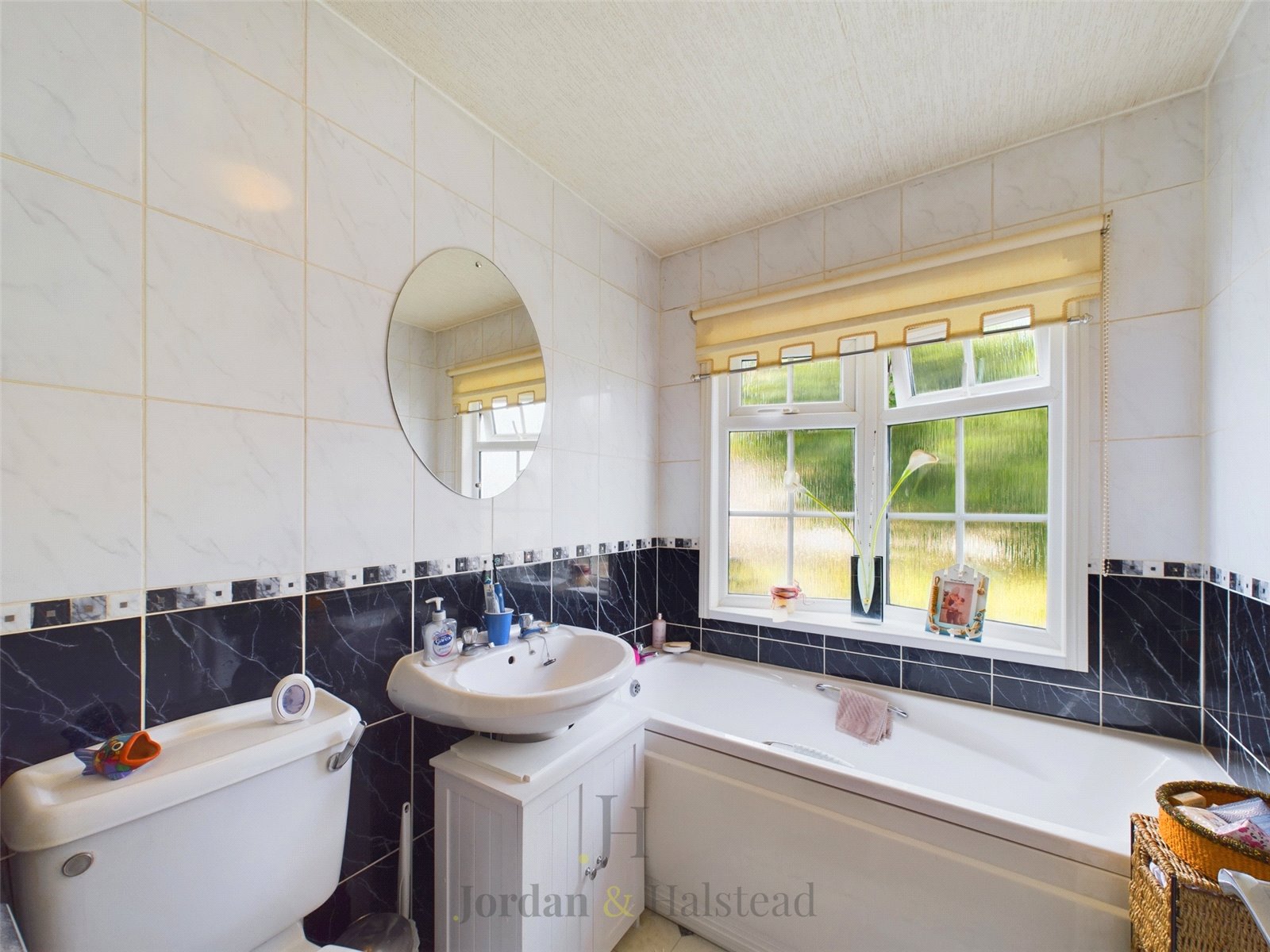 Double glazed obscure window to front aspect, tiled walls, low level wc, sink, bath and radiator.