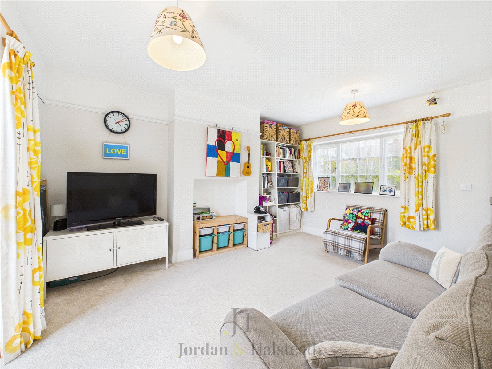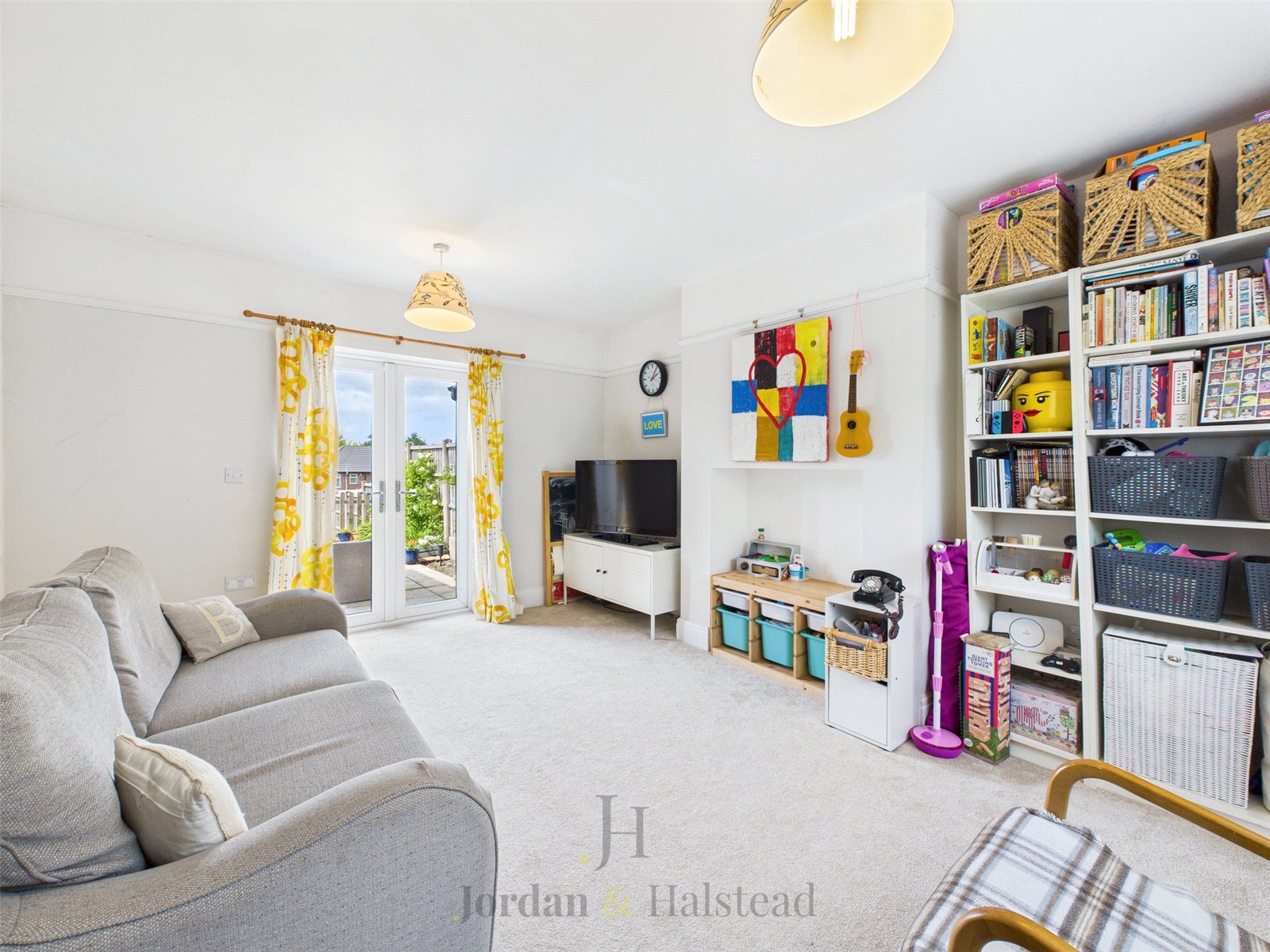 The living room is a bright and airy space with a double glazed window to the front and patio doors opening to the rear, allowing for plenty of natural light and creating a seamless flow out to the garden. A door from the living room leads into the kitchen.