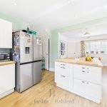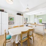 The kitchen diner is a fantastic family area, offering ample room for dining and everyday living. There are windows to both the front and rear elevations, built-in storage, wood-effect flooring throughout, and a radiator. The adjoining kitchen is fitted with a range of wall and base units with wooden worktops over and features a central island with storage underneath. There is space and plumbing for a washing machine, tumble dryer, and dishwasher, along with room for an American-style fridge. A free-standing oven with a four-ring hob completes the space. The kitchen also benefits from under-stairs storage, a side window, a UPVC door leading to the rear garden, and access to the downstairs WC.