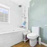 The upstairs family bathroom offers a clean and modern finish with an obscure glazed rear window, a wash hand basin set in a vanity unit with storage beneath, and a bath with chrome mixer taps and shower over. A glass screen, tiled splashback, part-tiled walls, and a radiator complete the room.
