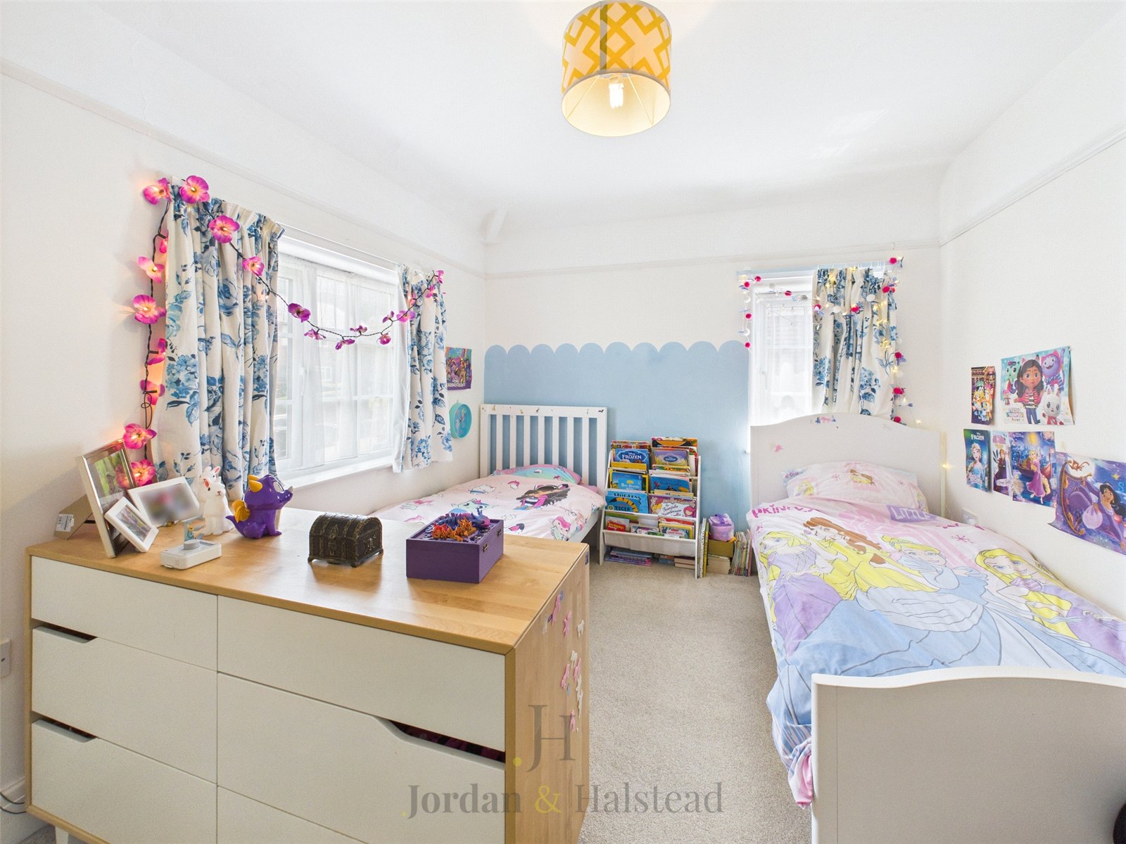 Bedroom two is another generous double, featuring windows to both the front and side elevations, a radiator, and access to the Jack and Jill en-suite.