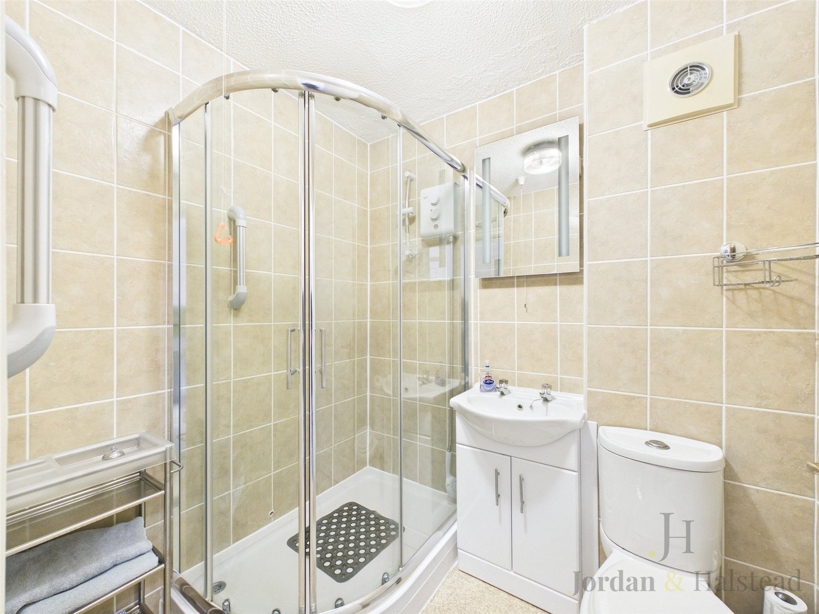 The well appointed shower room is fully tiled, with a good sized shower cubicle, WC and wash hand basin, set within a vanity unit.