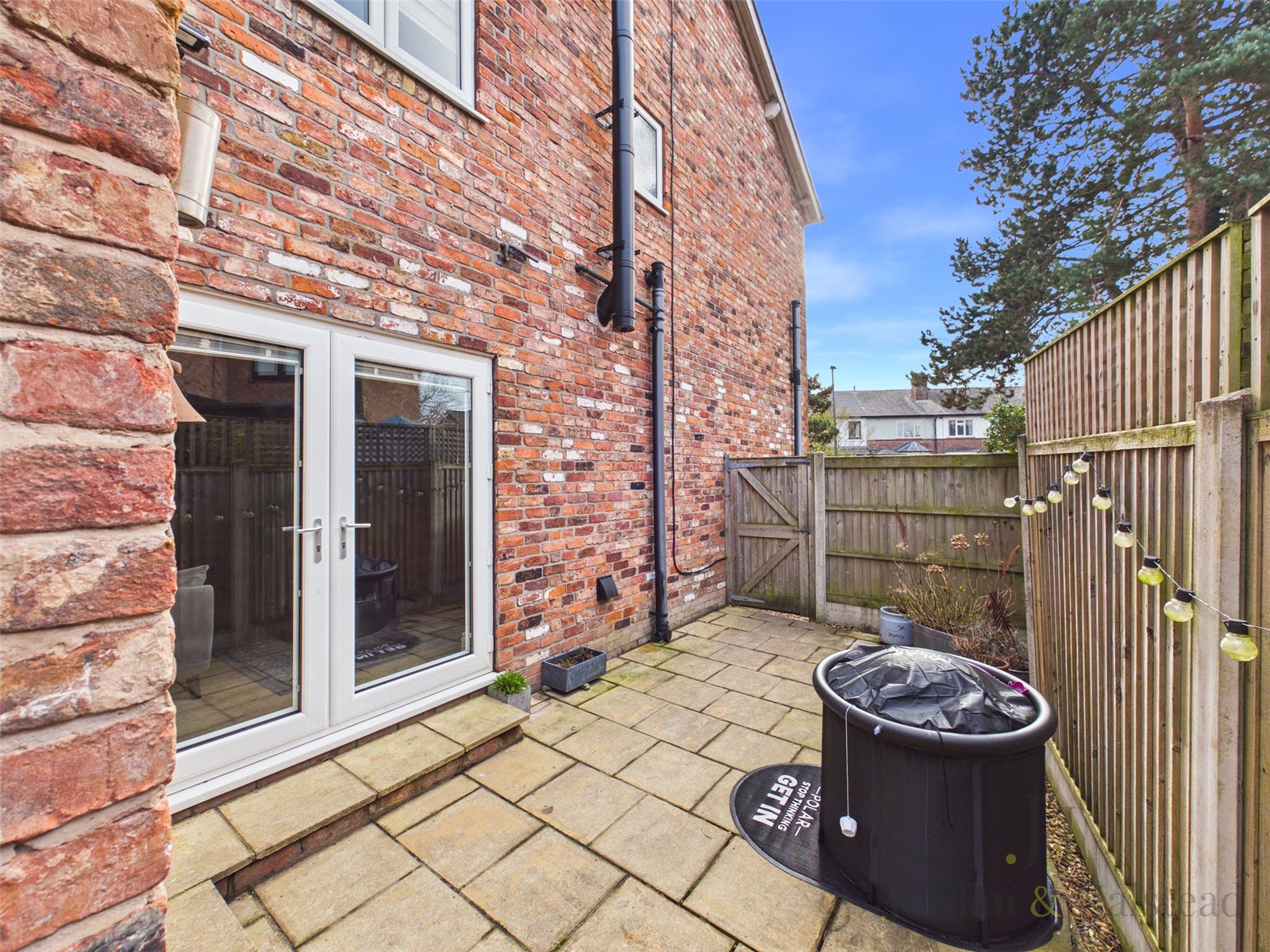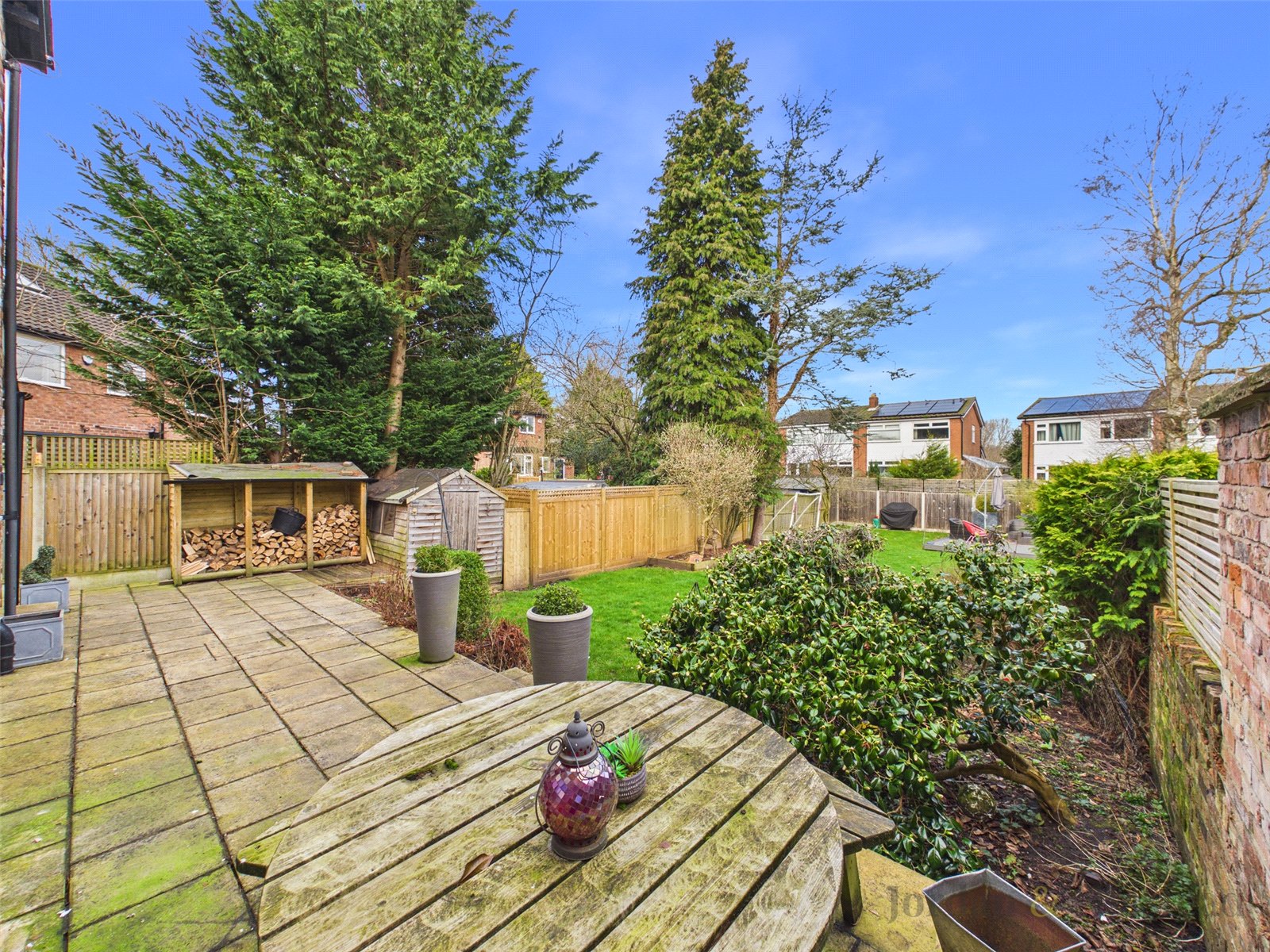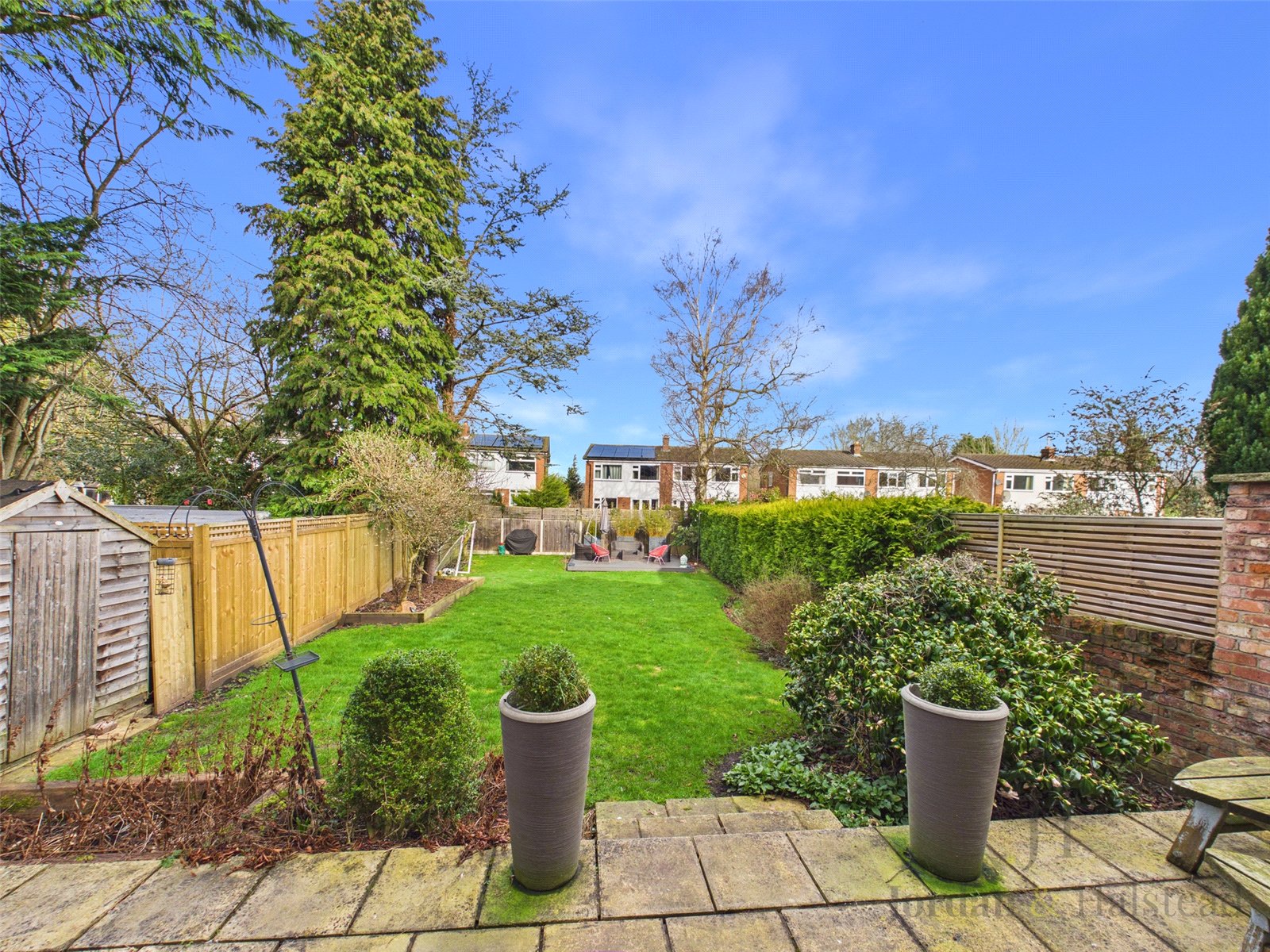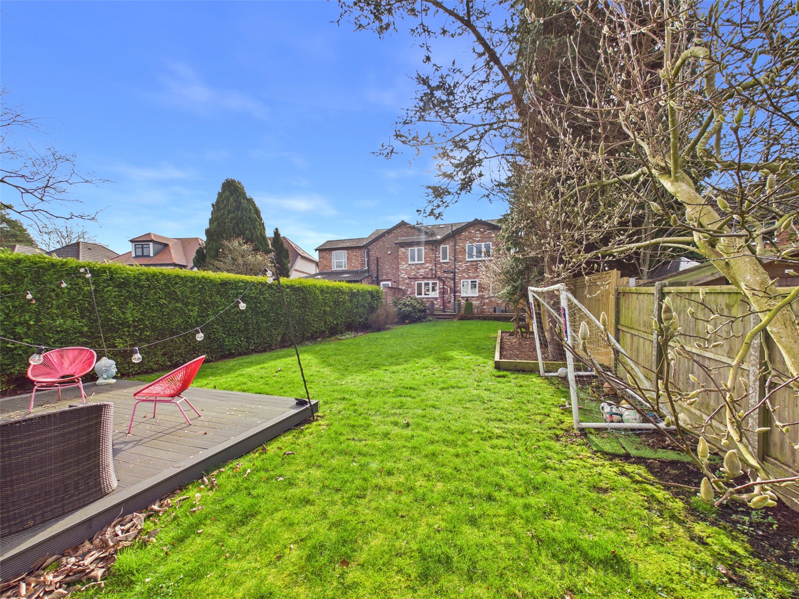 Externally, the rear garden can also be accessed from the side. Fully enclosed by brick walls and fencing, it provides privacy and security, complemented by mature trees and well established planting. A generous flagged patio area with steps leads down to a large lawn, extending to a decking area, ideal for alfresco dining and entertaining.