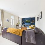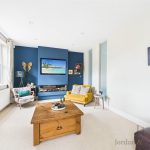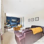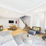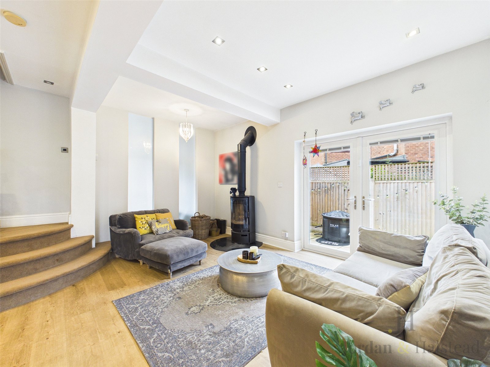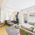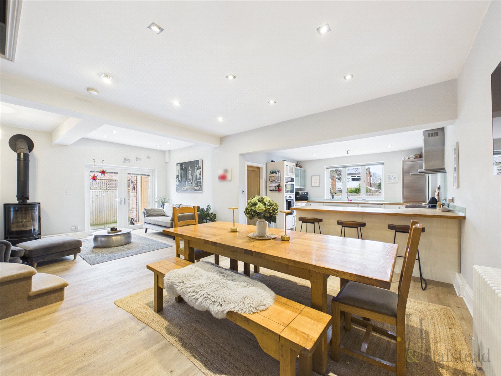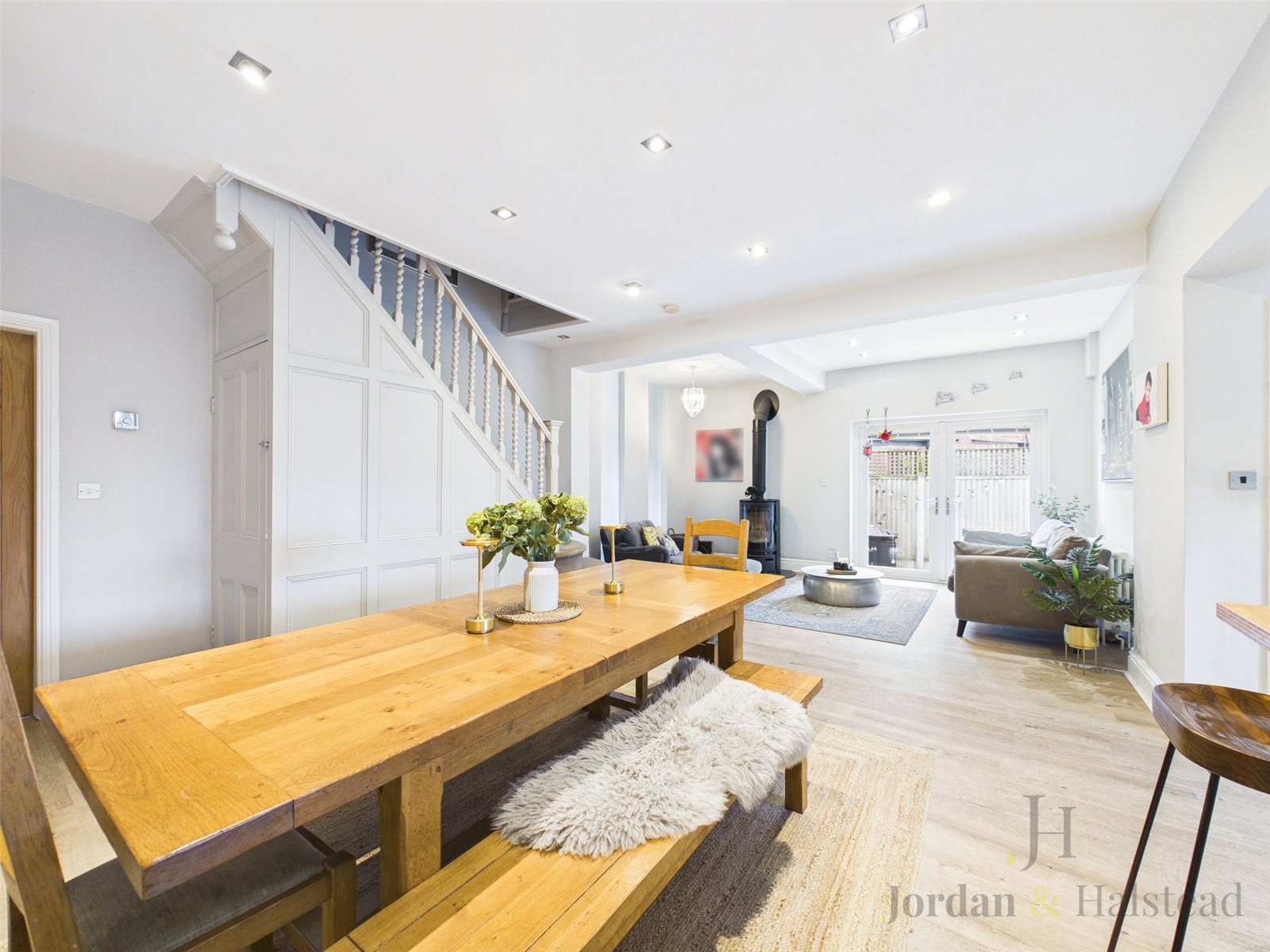 The kitchen offers an abundance of work surfaces, wooden worktops, modern cabinetry, and a range of high quality integrated appliances, including Bosch, Smeg, and Miele. The main living area is truly the heart of the home, complete with Karndean flooring, a charming log burner, and decorative panelling. Stairs rise from here to the first floor, enhancing the seamless flow of the space. From the kitchen, there is additional access to the side and rear of the property, leading again to the utility room, WC/cloakroom, and rear garden.